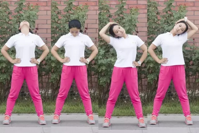 动作要领:身体直立,双手叉腰,双脚打开与肩同宽。尽可能地低头、仰头、向右侧头、向左侧头,各保持1个8拍。