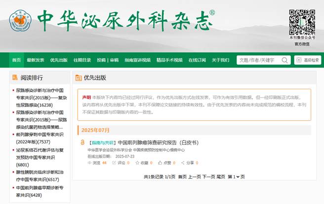 为全面落实国务院《健康中国行动(2019-2030年)》癌症防治行动目标,中国疾病预防控制中心慢病中心联合中华医学会泌尿外科分会于2024年6月牵头启动《中国前列腺癌筛查研究报告(白皮书)》(以下简称《白皮书》)编制工作。该工作汇聚中国人民解放军总医院张旭院士、中国疾病预防控制中心慢病中心吴静主任、中山大学孙逸仙纪念医院黄健教授、中国医学科学院肿瘤医院陈万青主任、中国疾病预防控制中心慢病中心王宝华主任医师、中国医学科学院肿瘤医院邢念增教授和复旦大学附属肿瘤医院叶定伟教授等30余位泌尿外科及公共卫生领域相关专家。项目开展期间,课题组深入全国多地进行实地调研和访谈,广泛收集地方实践经验和成果,完成撰写并多轮修改,并于2025年3月30日在北京成功召开定稿会,与会专家对报告内容进行了深入研讨和完善。截至2025年7月底,《白皮书》正式于《中华泌尿外科杂志》发布,为我国前列腺癌筛查标准化建设提供参考依据。
