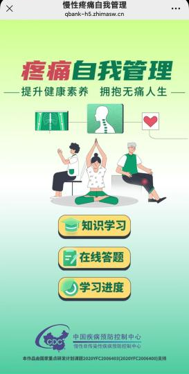 为了更好地让每个人都树立主动健康意识,掌握慢性疼痛自我管理的知识和技能,从而乐享生活,在国家重点研发计划课题“基于患者参与的老年神经病理性疼痛协同照护移动平台建设”(2022YFC3602204、2022YFC3602200)支持下,中国疾控中心慢病中心制作了慢性疼痛自我管理指南系列图解,包括疼痛自我管理技术知识库的学习答题等内容,供大家参考使用。
